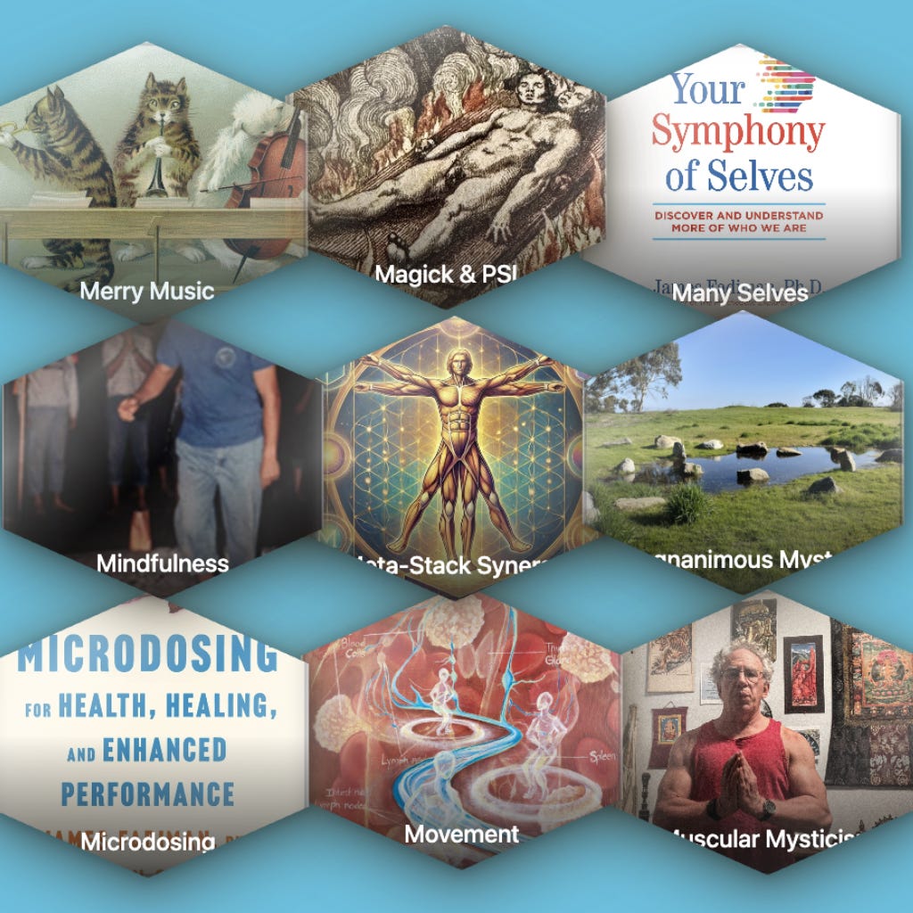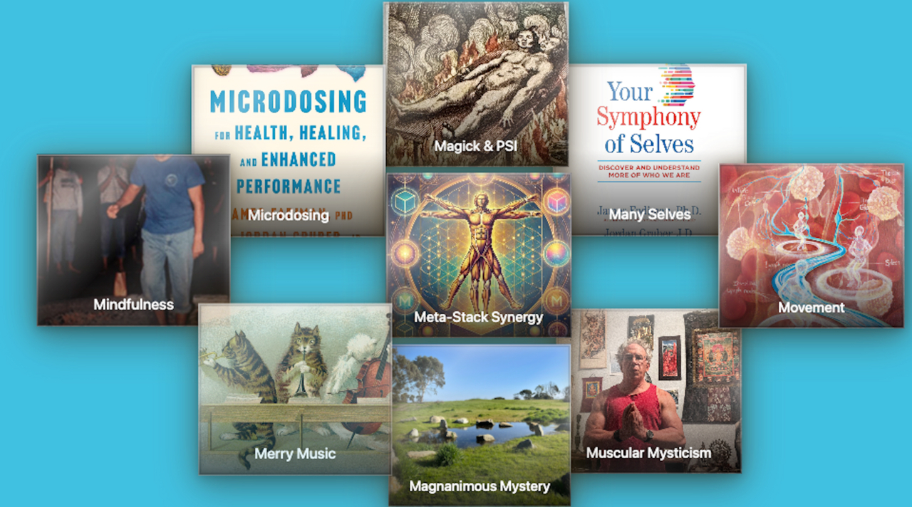 the Enlightened Stack: Microdosing. Multiplicity (Many Selves). Magick & PSI, Movement, Mindfulness, Muscular Mysticism, Miracles and Magnanimous Mystery, Merrey Music, and Meta-Stack Synergy from the original Enlightenment.Com's founder.